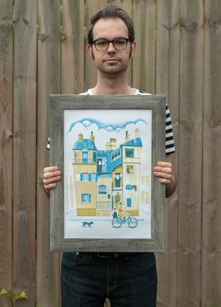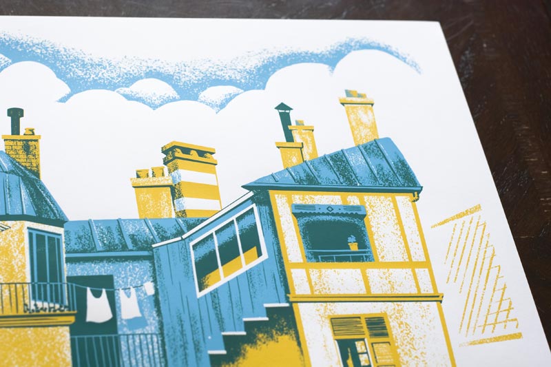 Take a ride through a whimsical version of 1950s France. This illustration was inspired by the 1958 film “Mon Oncle” by Jacques Tati. This highly detailed illustration has to be seen up close to really appreciate all the finer details.